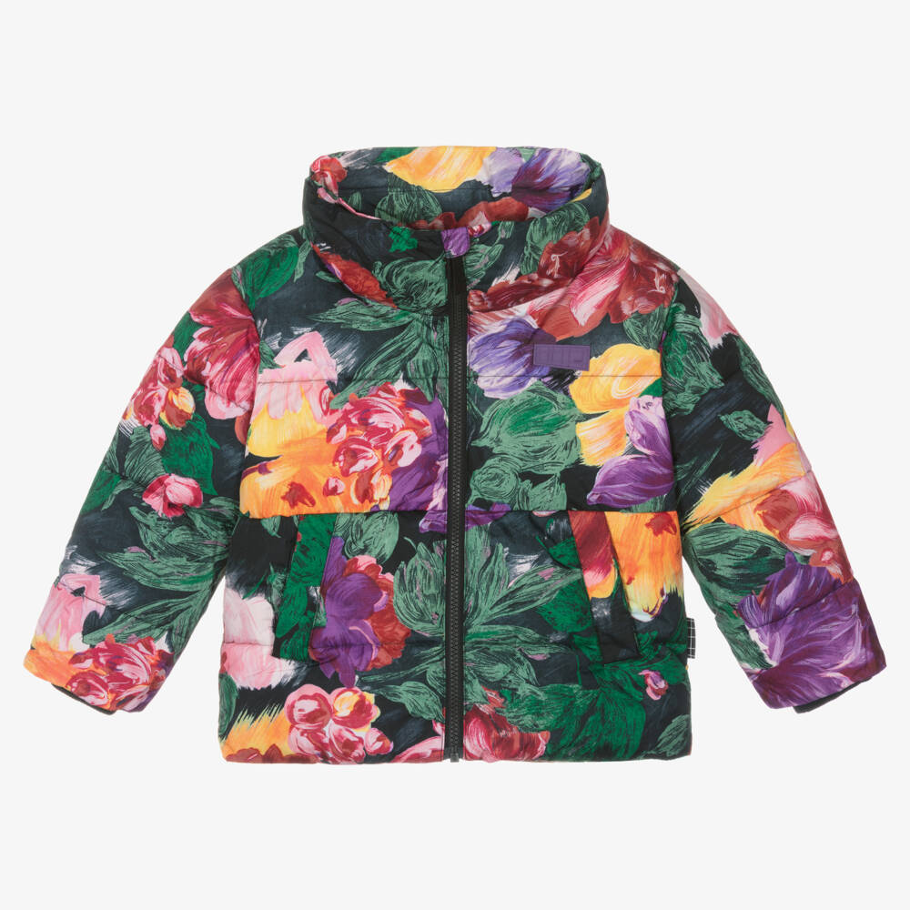 Stylish puffer jacket for girls by Molo, with a vibrant floral pattern. Soft, breathable and waterproof, it has a chunky zip down the front and an adjustable drawstring hem. There is a silky lining, with a detachable hood that fixes onto the collar with velcro. Made from recycled PFC-free materials, the jacket is padded with lightweight technical down for superior warmth. There are stretchy ribbed cuffs to keep out chilly winds. It has popper fastening front pockets, and a reflective logo print on the back for increased visibility.