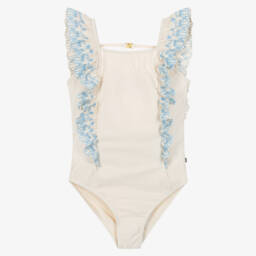Купальник для девочек от Molo с ярким тропическим принтом и оборками на плечах. Изготовлен из шелковистой и эластичной ткани с защитой UPF50+. Полностью на подкладке для комфорта. Узкие бретели перекрещиваются на спине.