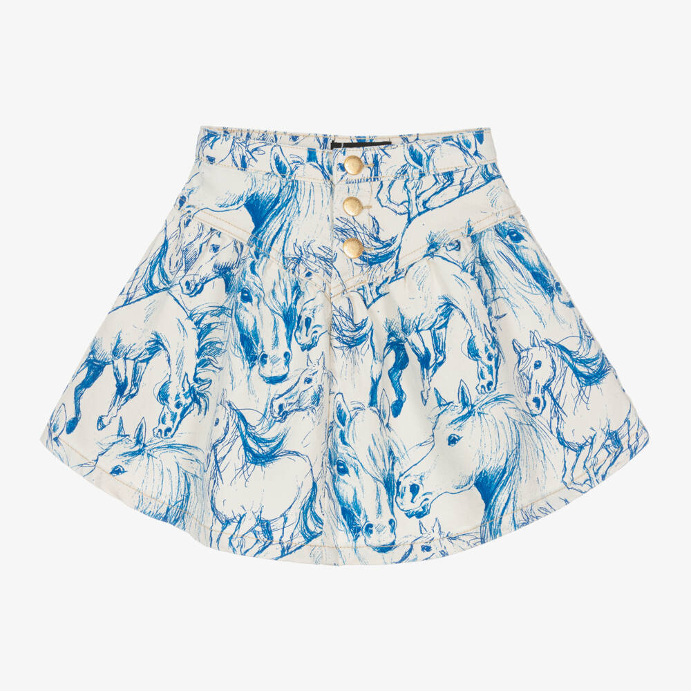 Stylish ivory denim skirt for girls by Danish brand Molo, with a sketched blue horse pattern. Panelled on the hips and gathered below that to create a full silhouette, it fastens with golden logo poppers on the front. Made in mid-weight cotton twill, it has a useful, adjustable waistband for a good fit.