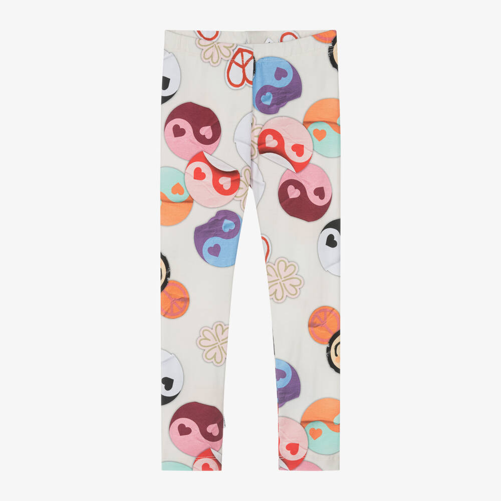 Casual ivory leggings for girls by Molo, made from soft and stretchy organic cotton jersey. Fun and spirited, they have multicoloured positive symbol pattern with peace signs and smiling faces for a cool vibe. They are easy to wear with a comfortable elasticated waistband.