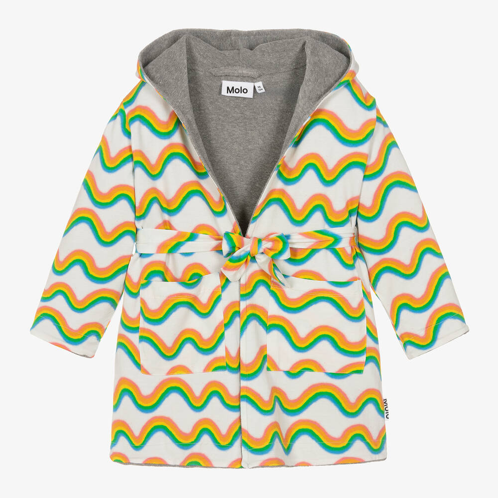 Fun and colourful, this ivory hooded bathrobe for girls by Molo is printed with a bright wavy rainbow pattern. Made from soft organic cotton jersey, it has patch pockets on the front and a detachable sash belt that ties around the waist. Lined in grey terry towelling, it is great to wear when drying off after a bath or a swim.