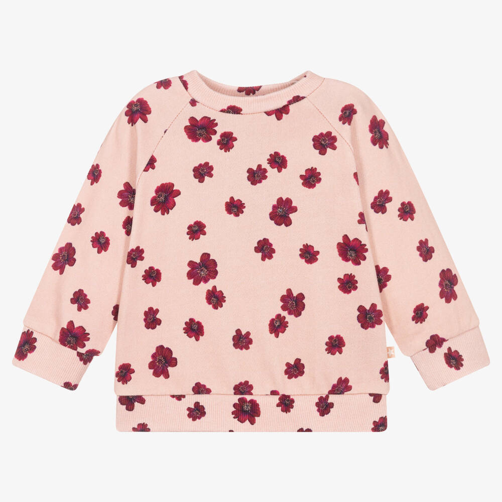 Dusty pink sweatshirt for younger girls by Molo, made in a comfortable light-weight organic cotton jersey. Ideal for layering, this crew neck is patterned with sweet fuchsia pink flowers, with gently ribbed trims for casual styling.