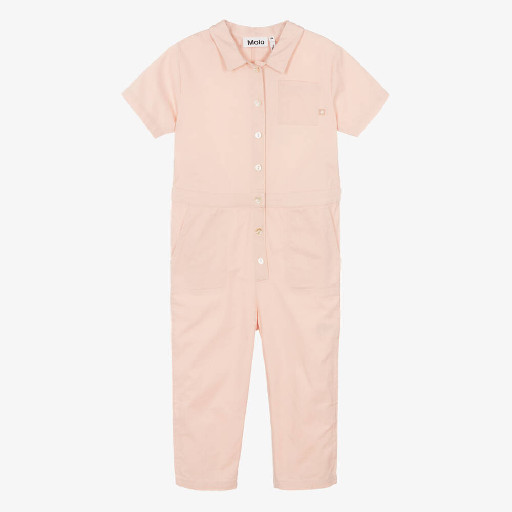 Dusky pink jumpsuit for girls by Molo, woven in soft cotton twill. In the style of an edgy boiler suit, it has a relaxed, straight shape and a star logo tab on the chest pocket. Fastening with front buttons, it makes a great outfit for casual days.