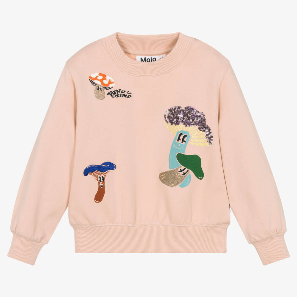 Pale pink organic cotton sweatshirt for girls by Molo, featuring colourful sequin, embroidered and printed mushrooms on the front. Made from soft, breathable jersey, this crew neck sweatshirt has ribbed trims for a cool and casual look.