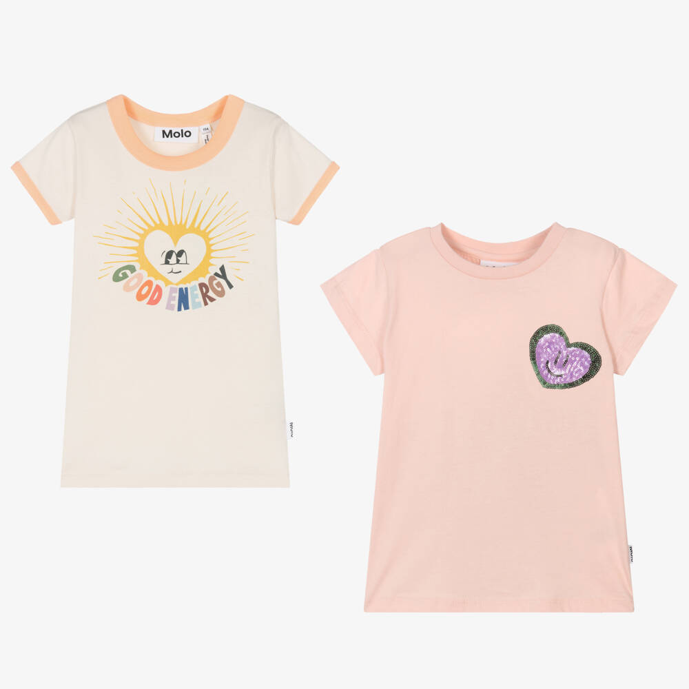 A pack of two organic cotton T-shirts for girls by Danish brand Molo, with happy face motifs. Just right for casual days, they are made in comfortable jersey with capped sleeves. The pink T-shirt has a sweet, smiling, sequined heart in purple and green, whilst the ivory T-shirt has a cute, smiling yellow heart with 'Good Energy' printed below, with contrasting, pale orange trims.