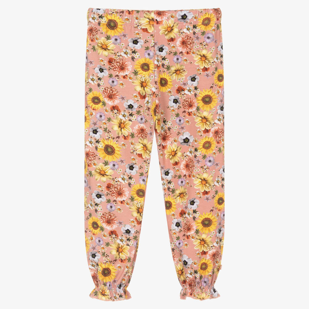 Pink trousers for little girls by Danish brand Molo, made in the softest organic cotton jersey. Pretty and playful, these trousers have a colourful graphic floral print. They are finished with an elasticated waistband and cuffs for comfort.