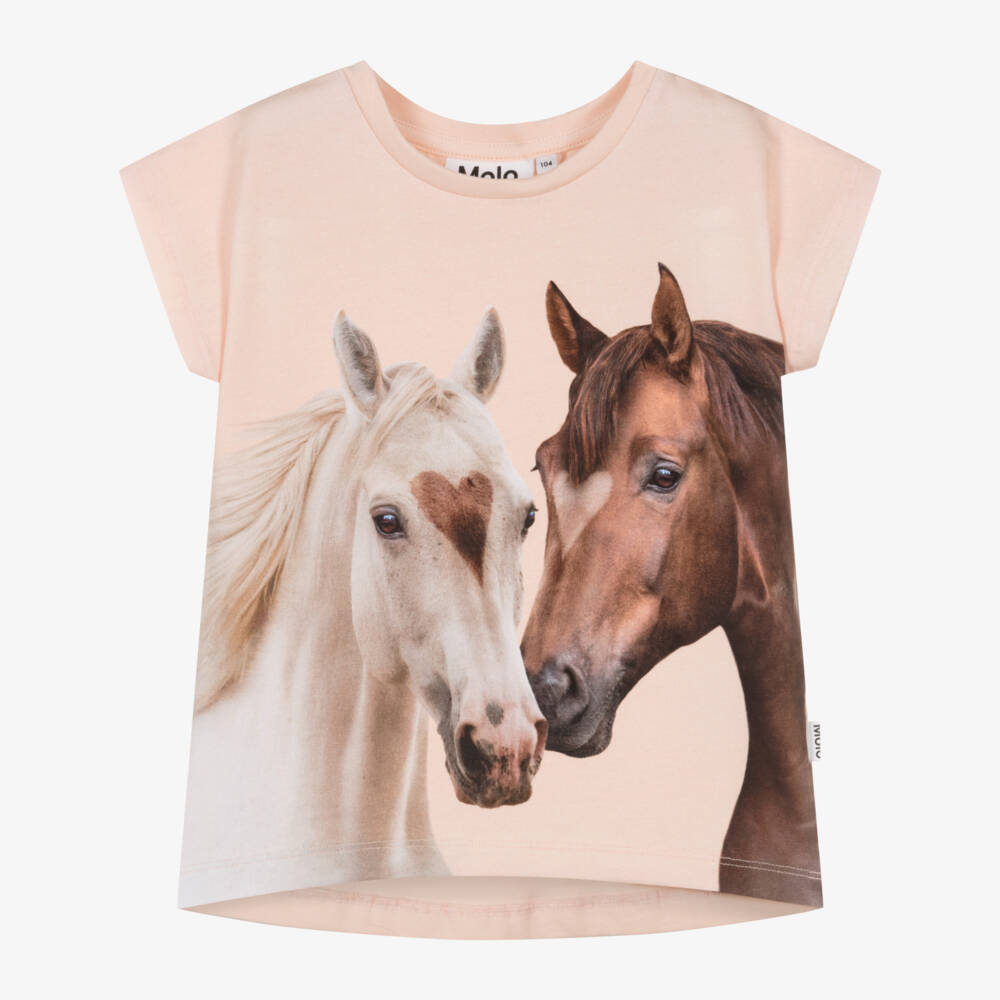 Pastel pink T-shirt for girls by Danish brand, Molo. Made in soft organic cotton jersey, it has a lovely print of two horses on the front. It has a crew neckline, seamless short sleeves and a logo tab sewn on the side seam.