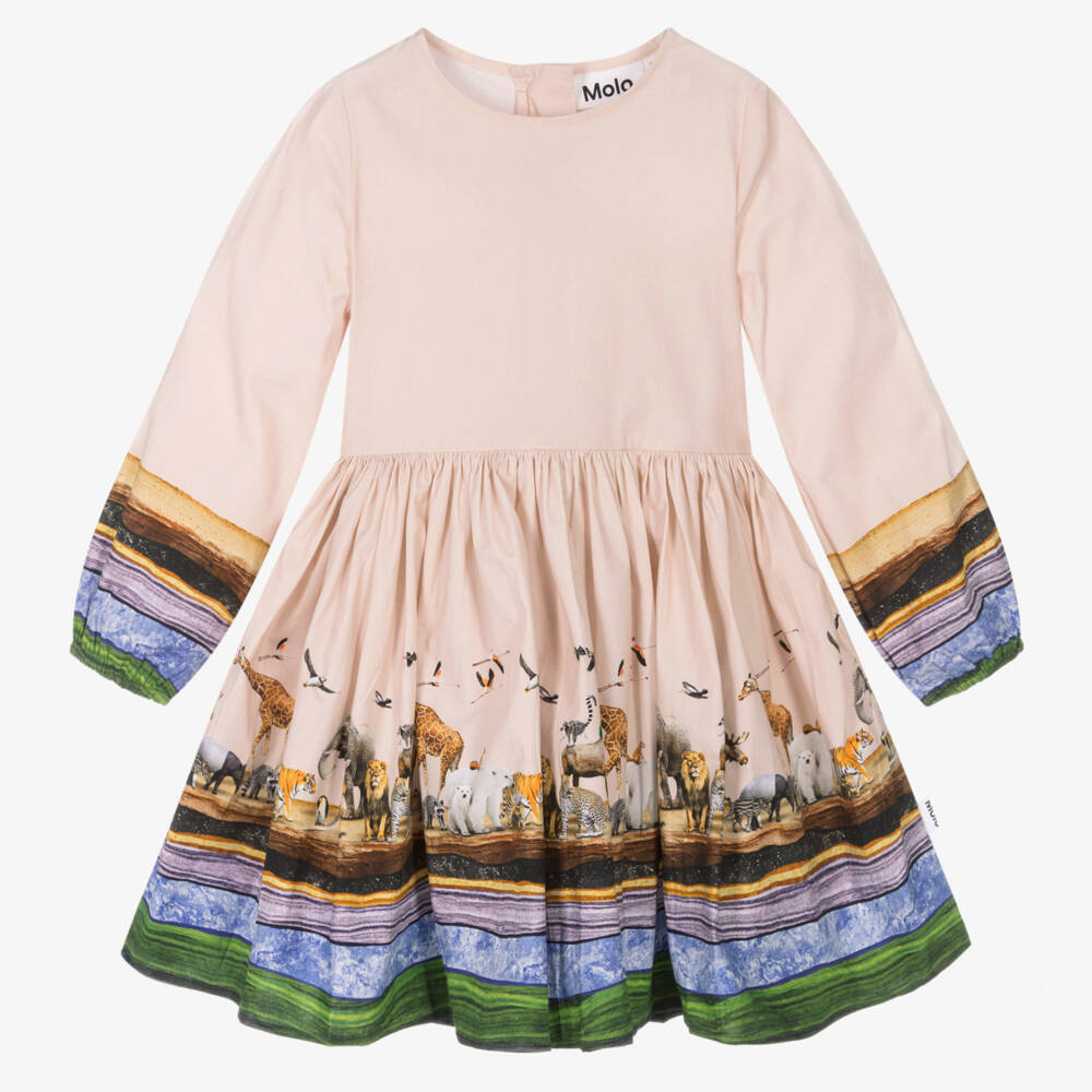A dusky pink dress for girls by Danish brand Molo, made in a light, organic cotton weave. Fastening with a zip on the back, this long-sleeved dress has a round neckline, a gathered waist and elasticated cuffs for added volume in the sleeves. The skirt and sleeves are printed with wide, colourful stripes, with a range of animals from across the world.