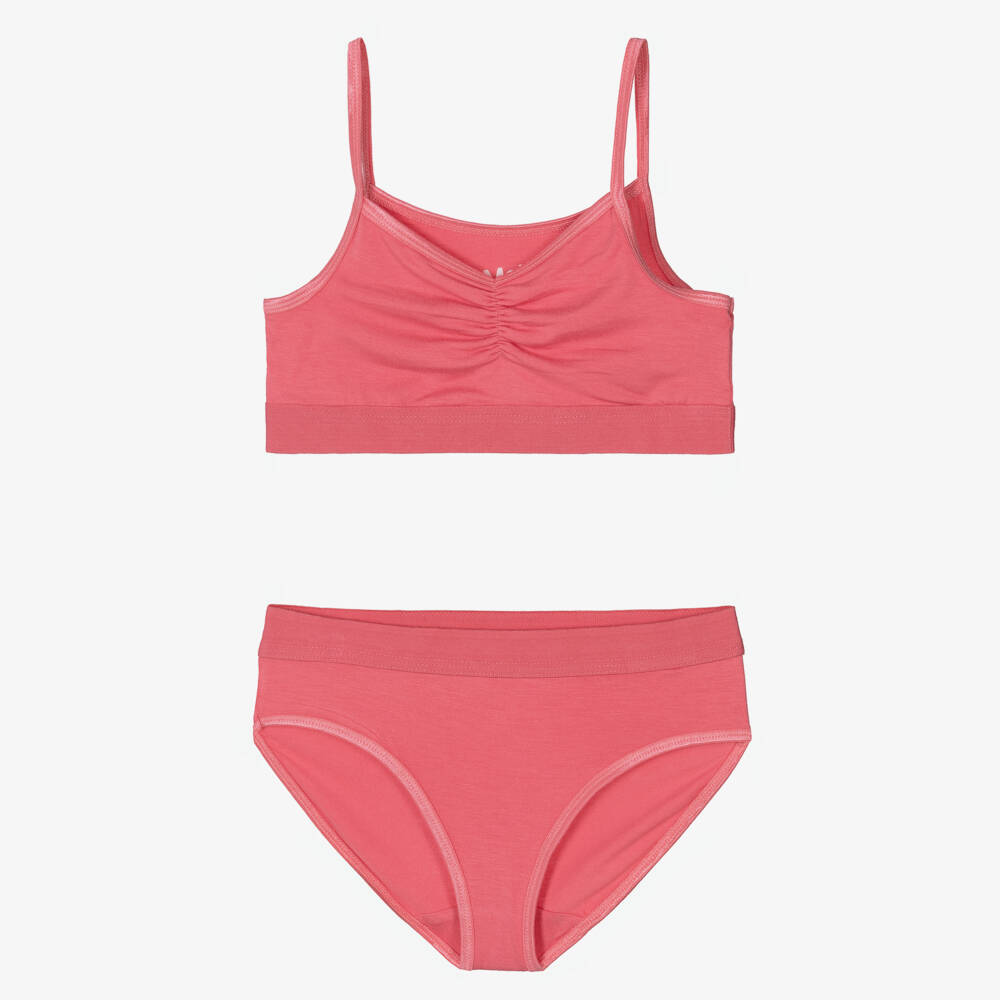 A pink bra top and knickers set for girls from Danish brand Molo, made in beautifully soft viscose jersey for comfortable wear. The top has narrow shoulder straps, a ruched detail on the front and a wide elasticated hem. The matching knickers have an elasticated waist for unrestricted movement. This lightweight underwear set contains sustainable Lenzing EcoVero fibres.