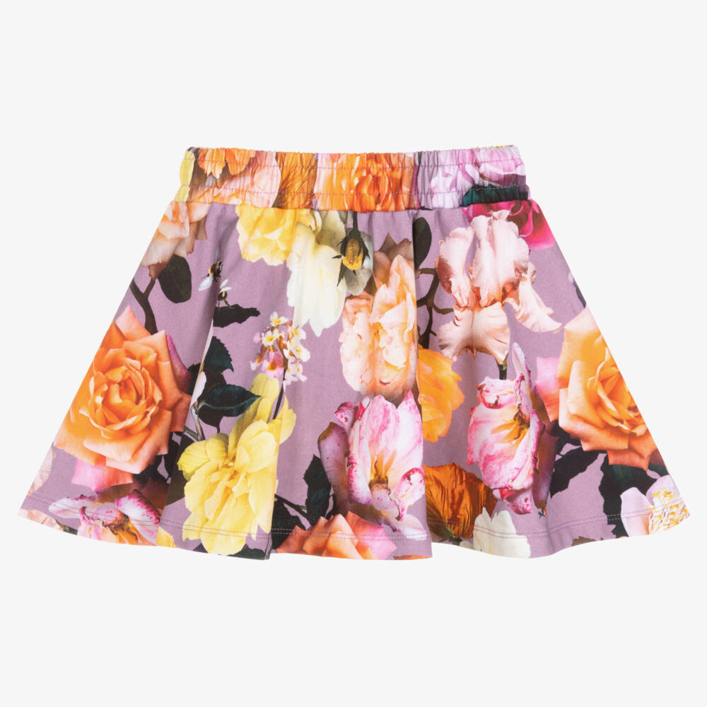 A lilac purple skirt for girls by Danish brand Molo, made in super soft organic cotton jersey. In a casual skater style, this skirt is patterned with vibrant flowers for a pretty, feminine look. The waistband is elasticated, ensuring easy and effortless dressing.