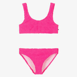 Lilac-purple and pink Molo bikini for girls, with a beautiful under-the-sea print. Made from silky, stretchy recycled fabric with UPF50+, it has a soft lining for comfort and pretty ruffle trims.
