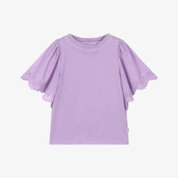 Girls lilac purple T-shirt by Molo, offering a pop of colour to any casual outfit. This soft organic cotton jersey tee features short flounced sleeves in lightweight cotton with delicate broderie anglaise detailing, adding an elevated touch.