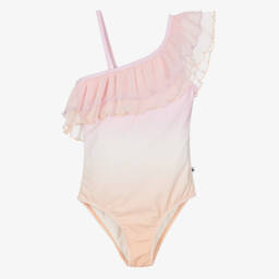 In a fun and vibrant watermelon print with pretty ruffle trims, this red and green swimsuit for little girls is by Molo. The fabric is silky smooth and stretchy, and has UPF50+. The bottom is lined and has extra room for a nappy.