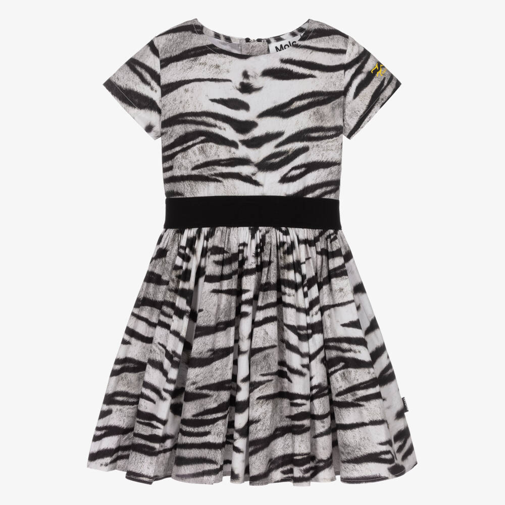 White and black dress for girls by Molo, made in soft cotton poplin. It has a lovely tiger print and there is a yellow Panthera logo printed on one sleeve. There is a wide, black elasticated waistband and an exposed, metal zip fastening on the back.