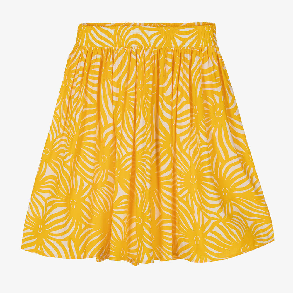 A fun yellow and white skirt for girls by Danish brand Molo, made in lightweight organic cotton poplin. With a wide elasticated waistband, this full, gathered skirt is designed in a happy sun pattern for a bright and cheerful feel.