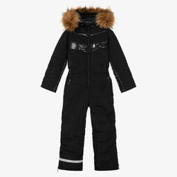 Little girls and boys green snowsuit from Molo, with a navy blue star pattern and taped seams. It is made in smooth polyester that is windproof, waterproof and breathable. There is reflective piping and star reflectors on the side and back. It has a front zip fastening and both the fleece lining and the interlining are made of recycled polyester. The hood is removable and the cuffs are elasticated for extra warmth.