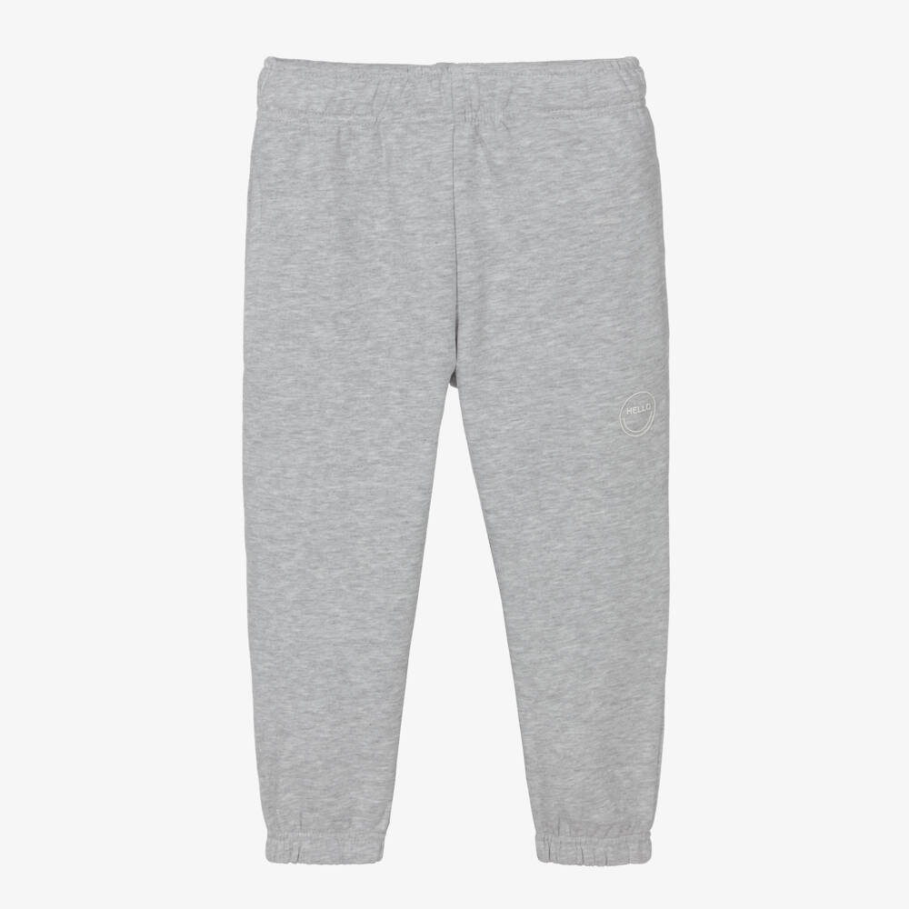 Casual grey marl joggers for boys and girls, by Danish brand Molo. Made in soft cotton sweatshirt jersey, they have a rubberised 'Hello' smiley face on one leg for a fun look. They have stretchy elasticated trims and a drawstring waist, promising comfort whilst lounging.