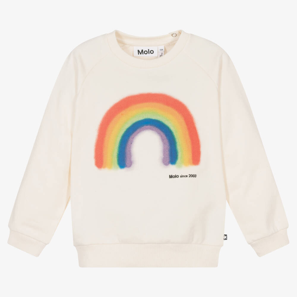 Fun ivory sweatshirt for boys and girls by Molo, made in soft organic cotton jersey. Printed with a colourful and bright rainbow on the chest for happy vibes, it has a relaxed crew neckline and stretchy ribbed trims for casual wear. It fastens with a popper on one shoulder and has a positive 'Still Different Together' print on the back of the neck.