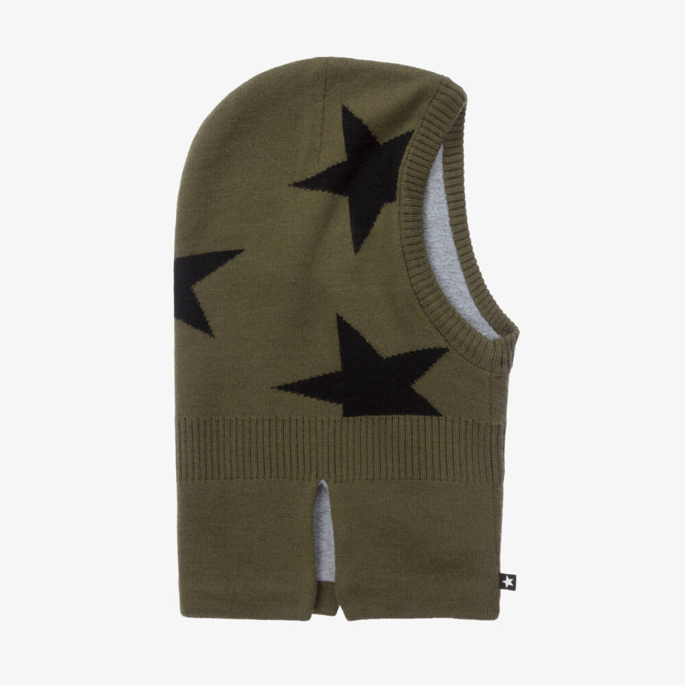 A khaki green knitted balaclava for boys and girls from Molo. Cosy and comfortable, it is made in a soft wool blend with a polar fleece lining for extra warmth. It is designed with a black jacquard star pattern and a black and white star logo tab on the front.