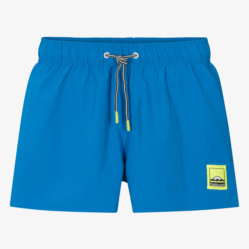 From Danish brand Molo, a pair of bright blue swim shorts for teen boys with a vibrant neon green logo patch on the front. Made with recycled fibres, they have a lightweight ripstop outer with UPF50+ and a soft mesh lining. The elasticated waistband has an adjustable drawstring tie and there is a useful pocket on the back.