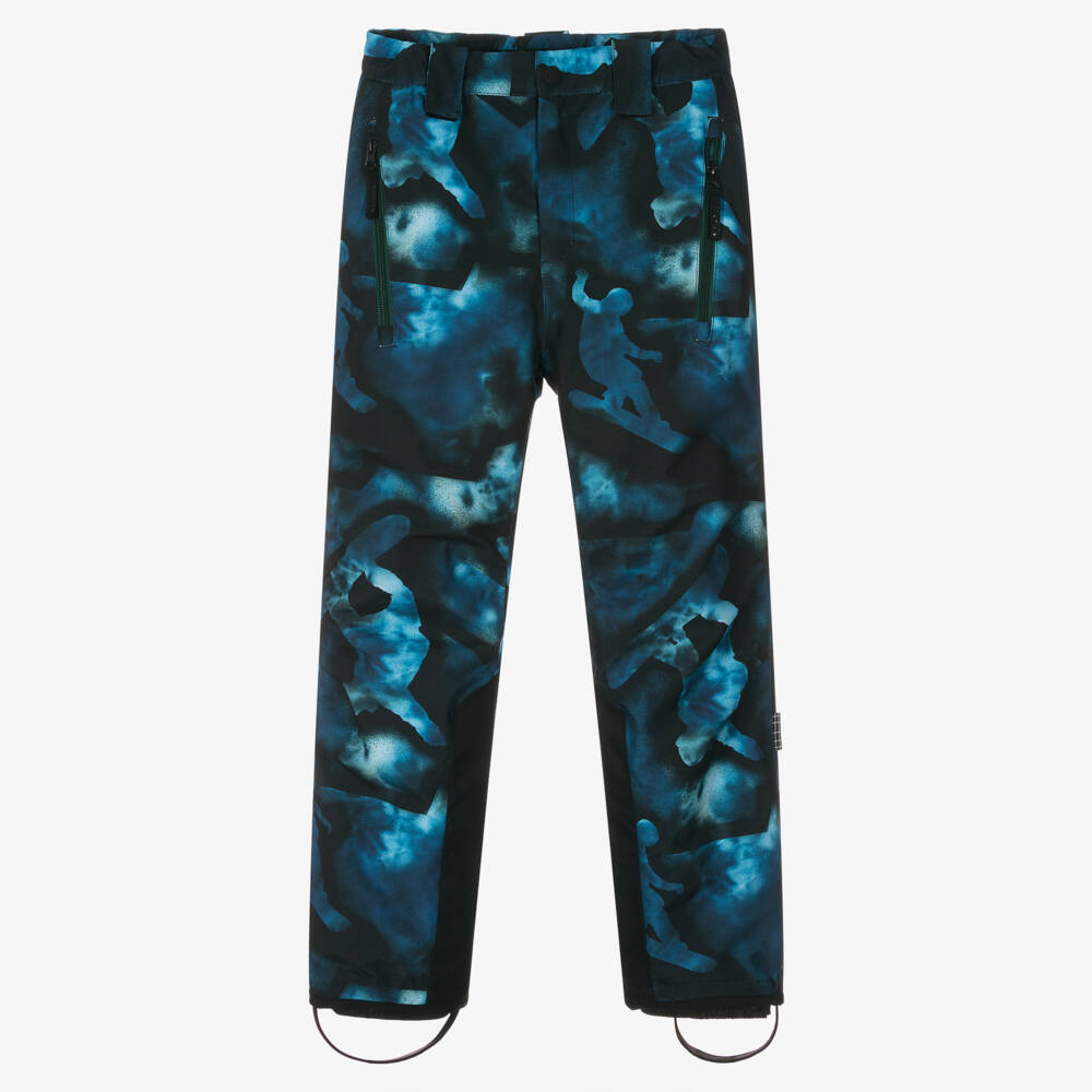Teen boys will be ready for the slopes with these blue tie-dye, snowboarder-patterned ski trousers by Molo, which will keep them dry, warm and visible from a distance. Waterproof, windproof and padded, they are made in soft, smooth and durable recycled fibres. These breathable trousers have lightweight insulation and are lined in cosy fleece, with taped seams to ensure they are waterproof. They have velcro cuffs with elasticated, popper-fastening, internal gaiters and removable rubber stirrups. Fastening with a logo popper and zip, they also have zipped front pockets with logo pull tabs and velcro-fastening belt loops. Light reflective detailing on one leg provides added safety.