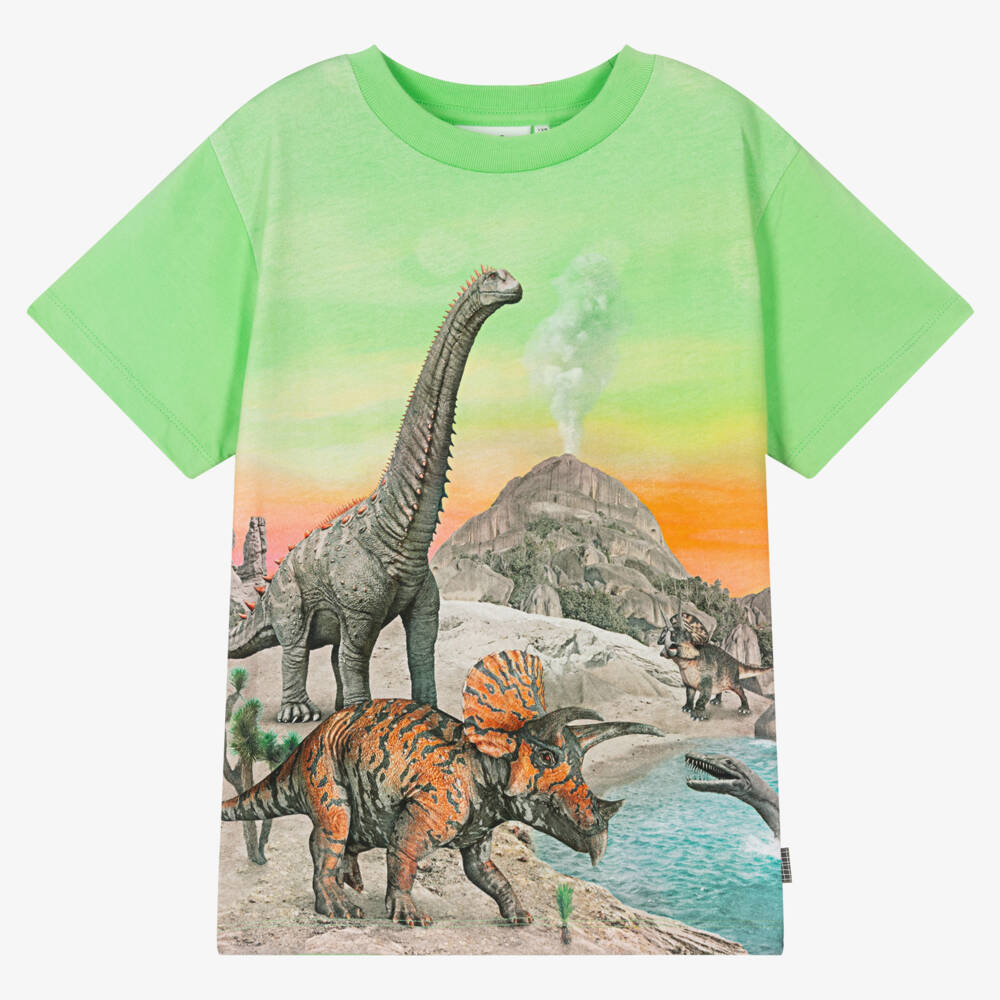 Teen boys green T-shirt by Molo, made in soft organic cotton jersey. In the designer's true fashion, it has a hyper detailed dinosaur and volcano print on the front, great for an eye-catching statement look.