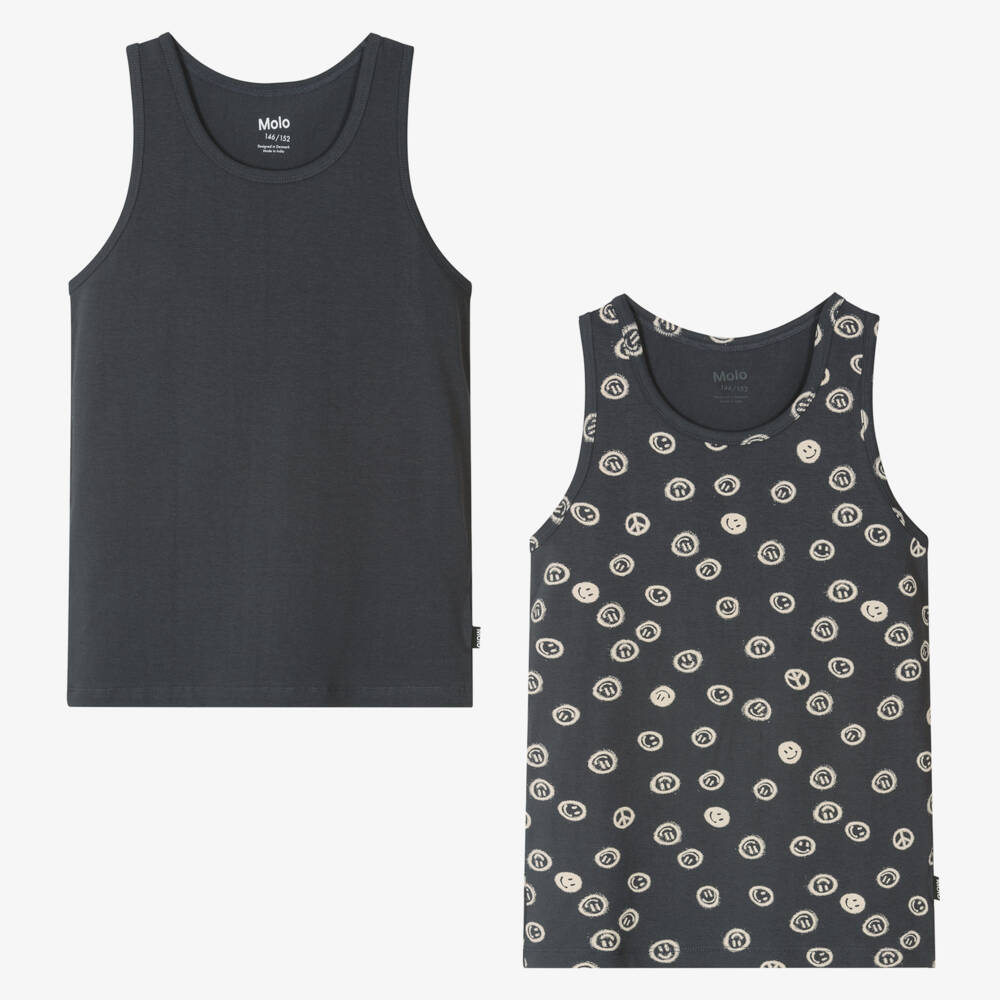 Pack of two vests for teen boys by Molo, with logo tabs on the side for a subtle designer touch. One vest is in a plain grey-blue shade and the other has a fun beige smiling face print. They are made in super soft, organic cotton jersey for a comfortable fit.