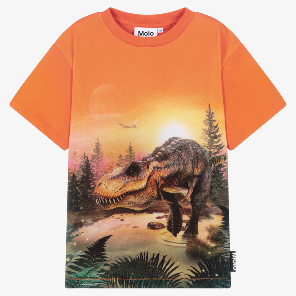 Fun orange organic cotton T-shirt for teen boys by Danish brand Molo, with a T-Rex in a lake print. It is made in soft, stretchy jersey for relaxed, casual days and has the designer's logo tab on one side seam.