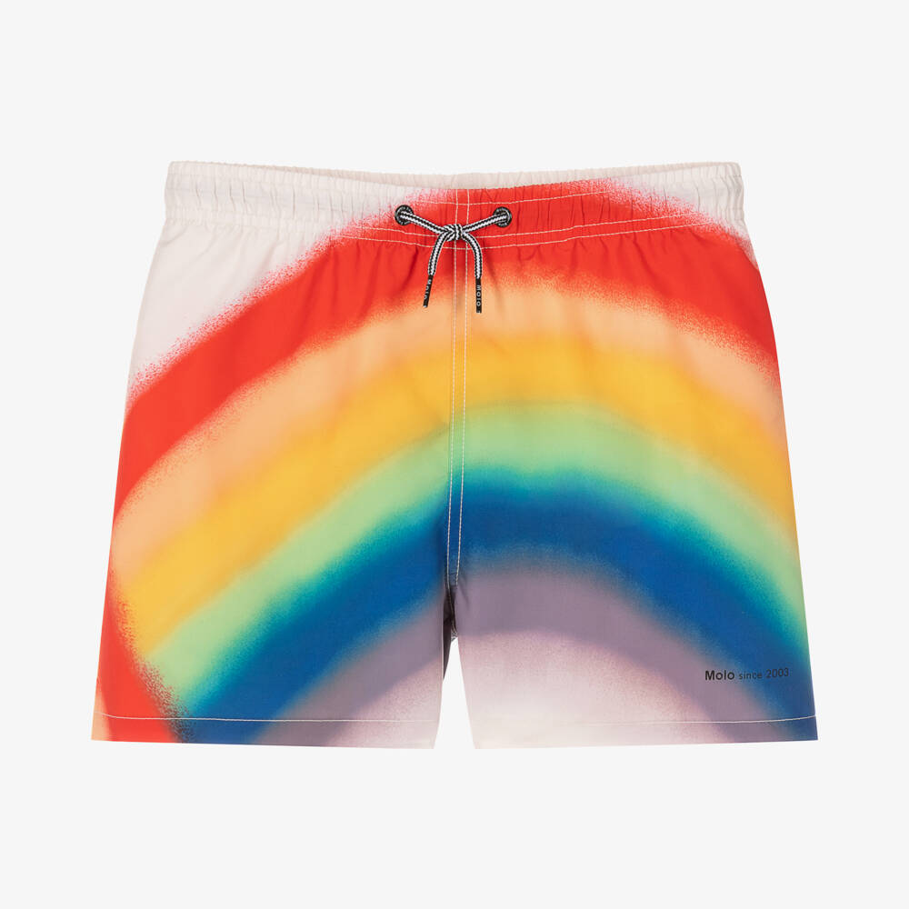 Fun beige UPF50+ swim shorts for teen boys by Molo, adopting rainbow spray colours for a bold vibe throughout the design. To mark the brand's twenty years jubilee, they have 'Molo since 2003' printed in black on one leg. Silky and lightweight with a mesh lining, they have a black and white drawstring on the waist and silicone logo patch above the faux pocket for a branded look.