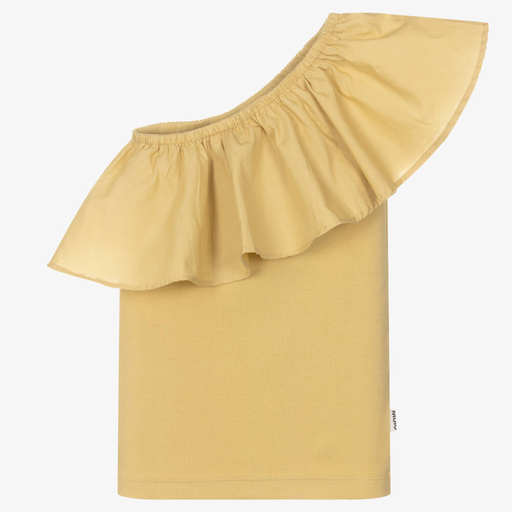 Stylish and comfortable for teen girls, this beige asymmetric top is from Danish brand, Molo. Made in soft organic cotton ribbed jersey, it has a statement poplin ruffle around the neckline and over one shoulder.