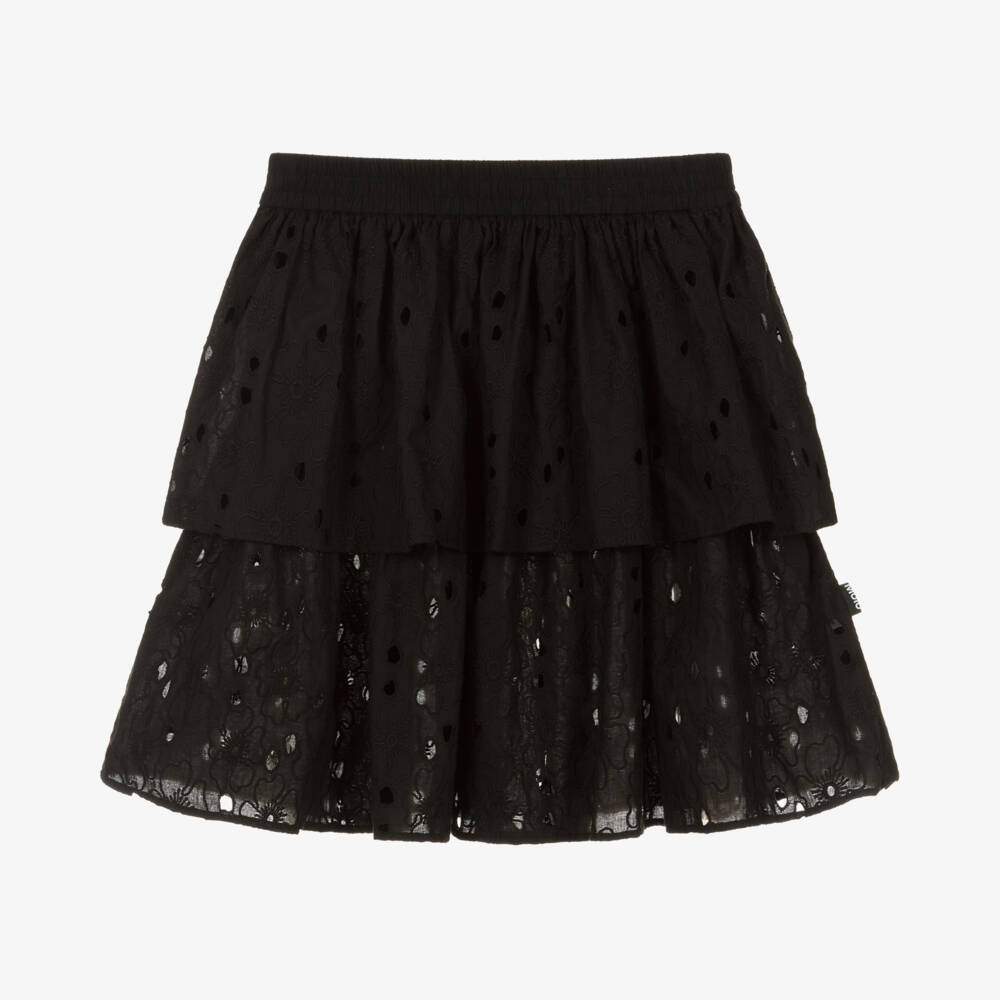 Casual and comfy for teen girls, this black tiered layered skirt is by Molo. It is made in lightweight cotton, with lovely broderie anglaise detailing. There is an elasticated waistband for easy pull on, with a branded tab on the side seam for a designer touch.