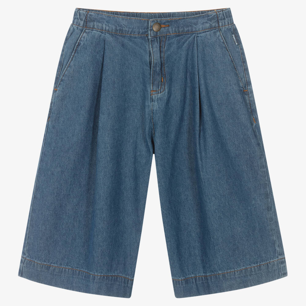For a 90's-inspired vintage look, these navy blue Bermuda shorts are designed by Molo and are made for teen girls. In a super wide leg style, they have contrast stitching in classic denim styling and a logo tab on the side seam. Fastening with a button and zip, all the hardware on these shorts is embossed with the designer's logo for a branded touch. This item contains 50% organic cotton fibres.
