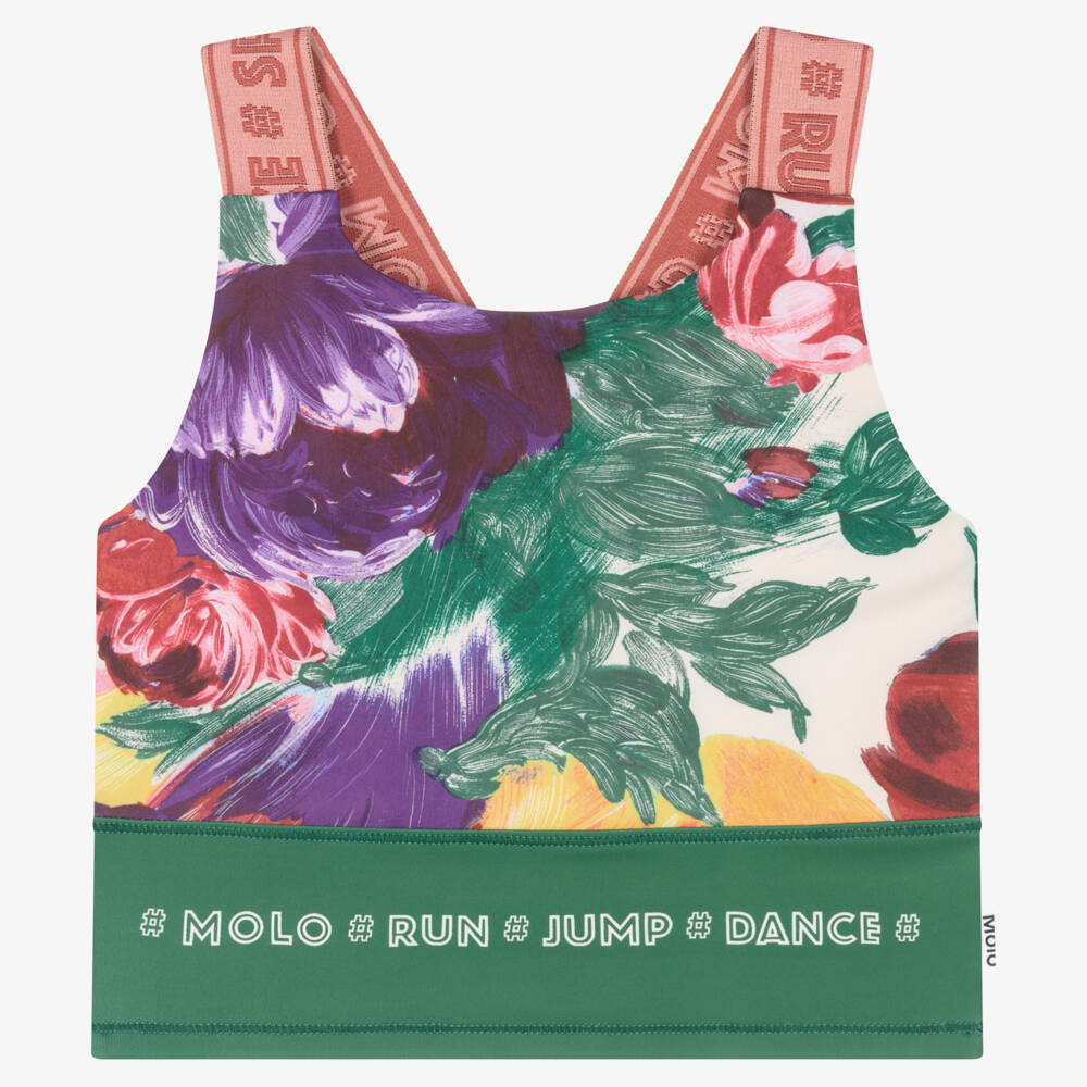 Stylish green and pink cropped activewear top for teen girls by Molo, patterned in a colourful floral print. Lined in a breathable mesh jersey, it is silky smooth and has a smart temperature control feature to keep cool and comfortable, with the addition of flat seams to prevent rubbing. The green underband is printed with fun hashtags and logos to coordinate with the pink jacquard shoulder straps for a super sporty vibe.