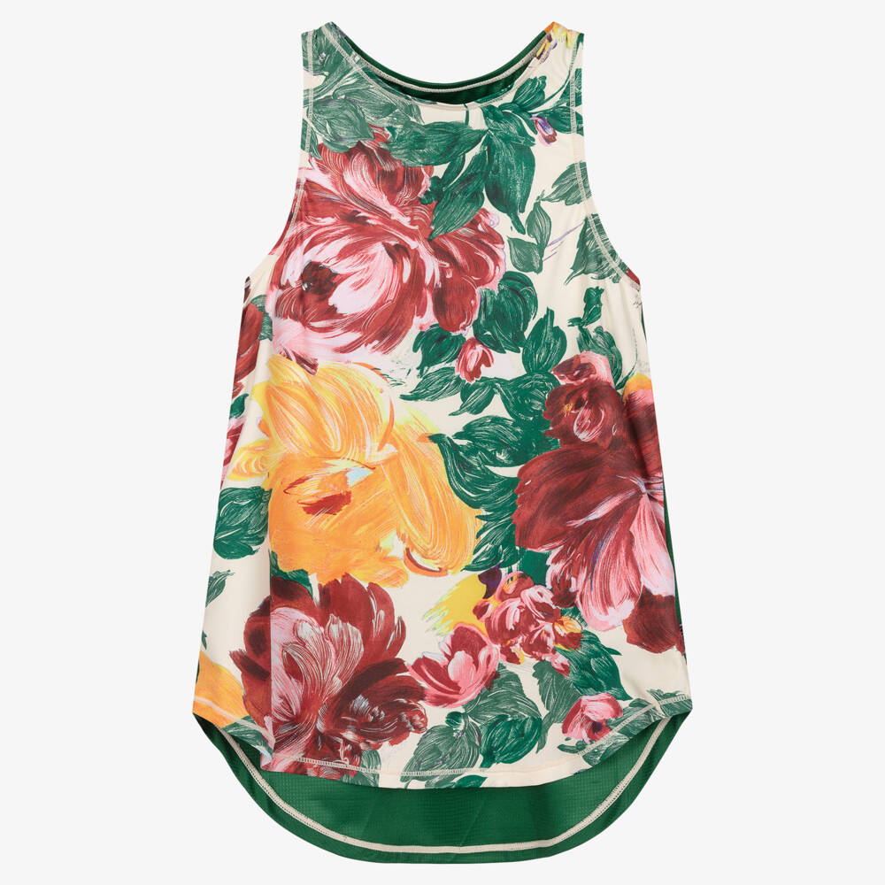 Combining performance and style, this sleeveless activewear top for teen girls is by Molo. The ivory front is patterned in a colourful floral print and the racer-back is plain green, with fun hashtags and logo print in white to match the exposed stitchings. It is made in silky soft jersey with a smart temperature regulating feature which helps the body to cool down, ensuring optimum comfort. It has a rounded hem, with a logo tab on the side seam.