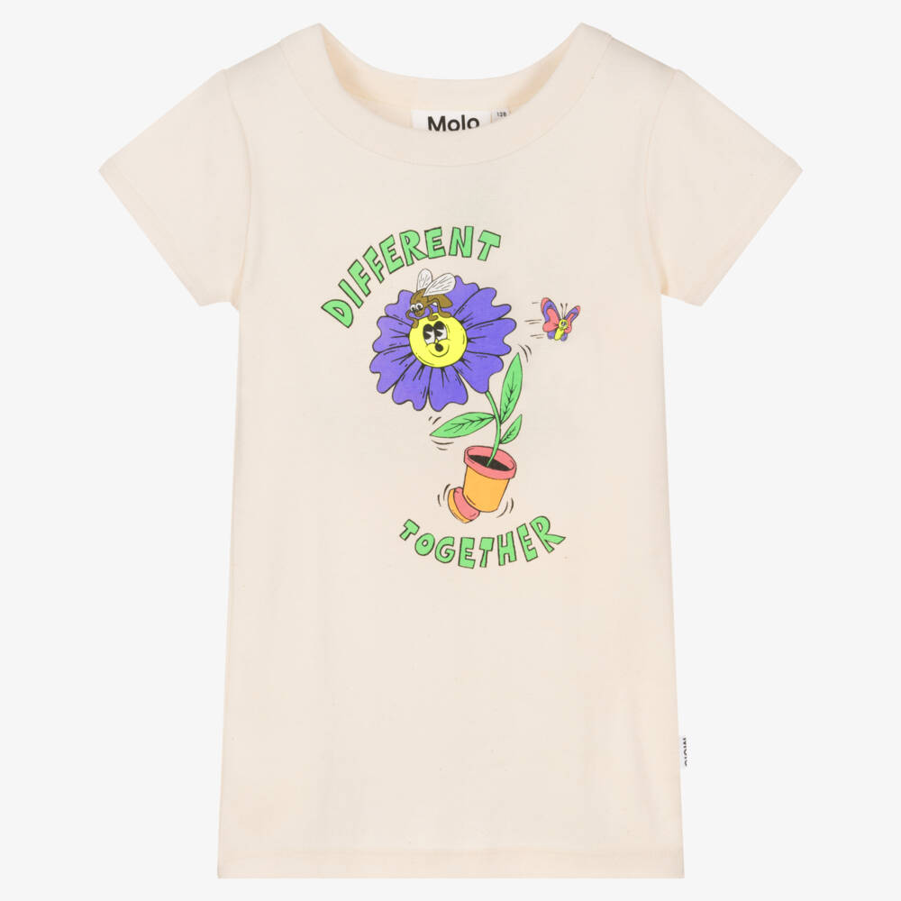 Ivory T-shirt for teen girls by Molo, with a fun and colourful 'Different Together' illustration on the front. Slim fitting, it is made in soft organic cotton jersey, with a branded tab on the side for a designer finish.