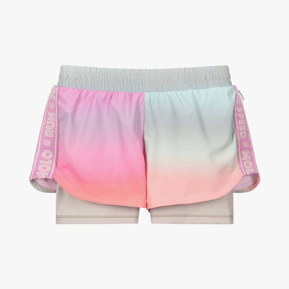 Combining sports with fashion, and using recycled materials, these activewear shorts for teen girls are by Molo. The silky soft outer shorts have a pink and blue ombré effect, trimmed with lilac pink logo tape down on the sides. The beige inner shorts are made in technical jersey using HeiQ Smart Temp, which supports the body's own ability to cool down, ensuring optimal comfort. The waist is elasticated for a good fit and easy pull on. A branded tab on the side seam adds a finishing designer touch.