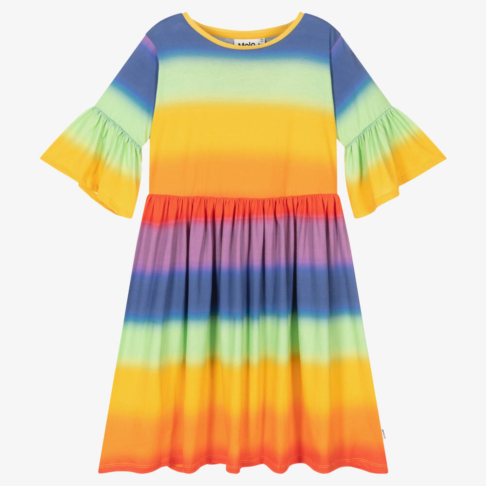 Fun and colourful organic cotton jersey dress for teen girls by Molo, in a cheerful rainbow spray design. Bringing on vibrant shades and positive vibes, it has 'Molo since 2003' printed on the back, paying homage to the brand's twenty years jubilee. This lovely casual look has pretty bell sleeves and a gathered waist and a small logo tab for a subtle branded finish.