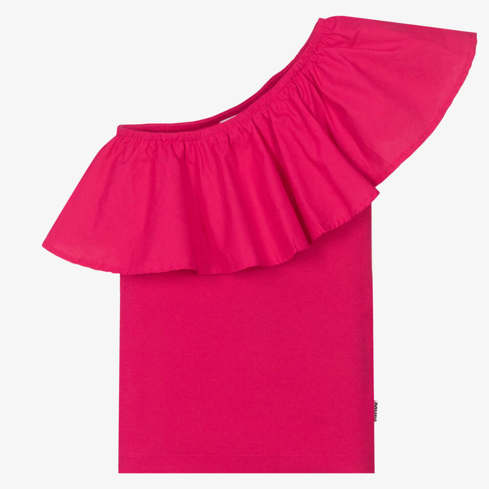 Stylish and comfortable for teen girls, this dark pink asymmetric top is from Danish brand, Molo. Made in soft organic cotton ribbed jersey, it has a statement poplin ruffle around the neckline and over one shoulder.