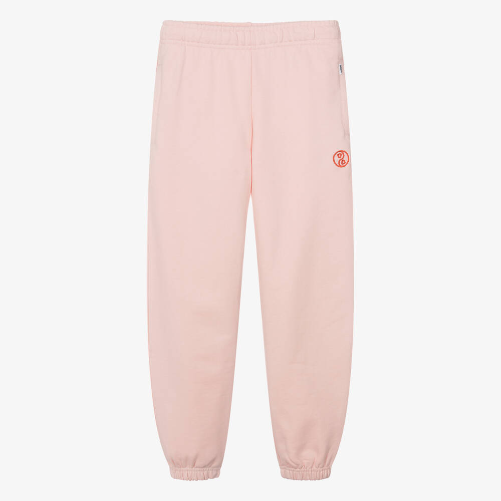 Pretty pale pink jersey joggers for teen girls, designed by Molo in a relaxed-fitting style. Spreading a positive message, they have a bold red peace symbol embroidered on one leg with a tab logo on the front. They are made in soft organic cotton with an internal drawstring waist, side seam pockets and a faux back pocket.