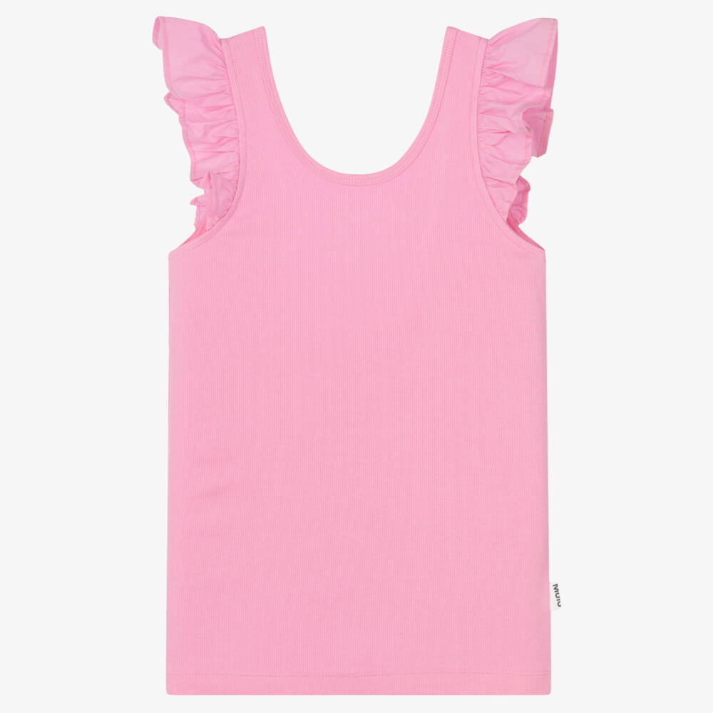A bright pink vest for teen girls by Molo, transformed with poplin ruffle trims on the shoulder straps. Made in soft, ribbed organic cotton jersey, this versatile piece has a rounded neckline and a scooped back. There is a branded tab on the side seam for a discreet designer touch.