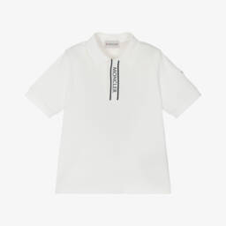 Ivory cotton piqué polo shirt by luxury label Moncler Enfant, with a navy blue rubberised logo on the grosgrain placket. The brand's iconic felted logo badge on one sleeve adds a signature finish.