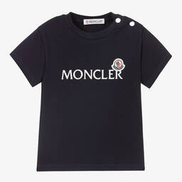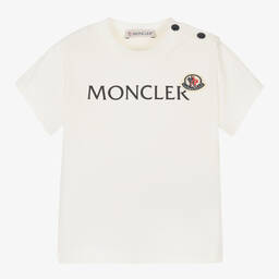 Ivory T-shirt for little boys by Moncler Enfant, stamped with the brand's signature logo badge alongside a bold black logo print. Made in soft cotton jersey, there are popper fastenings on one shoulder for easy dressing.