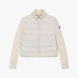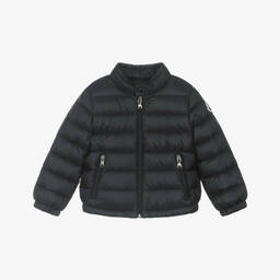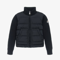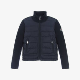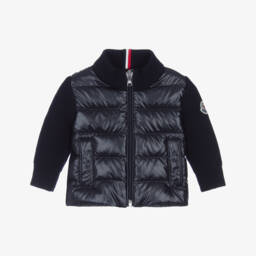 Navy blue cardigan for little boys by luxury brand Moncler Enfant, made in a ribbed virgin wool knit and enhanced with a down-padded front. A combination of textures, this warm layer has a front zip fastening, two front pockets and a gently padded collar. A Moncler Archive logo is embroidered on the chest and the iconic felt logo patch is sewn on the sleeve.
