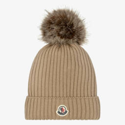 A cosy ivory beanie hat for girls by luxury brand Moncler Enfant, knitted in soft virgin wool. Decorated with a fluffy faux fur pom-pom, it has the iconic felt logo patch on the front sewn on the turned-up brim for a branded look.