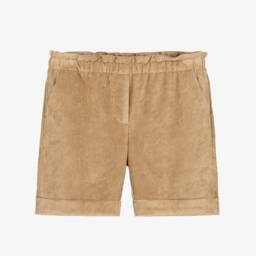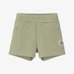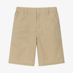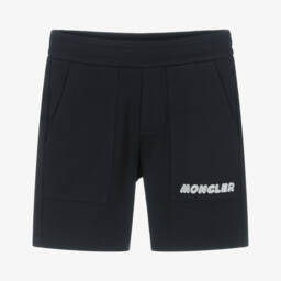 Off-white casual shorts for teen boys by French luxury brand Moncler Enfant, made in soft cotton with stretch. They have an all over navy blue logo lettering pattern with a navy blue rubber logo on the back. The elasticated waistband is covered in navy blue silky nylon and there are slanted pockets on the front.