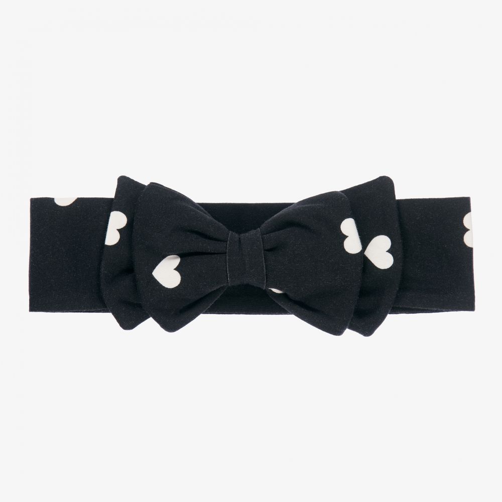 Girls black cotton jersey headband by luxury brand, Monnalisa, with a white hearts print. Soft and stretchy, there is a large fixed bow on the front.