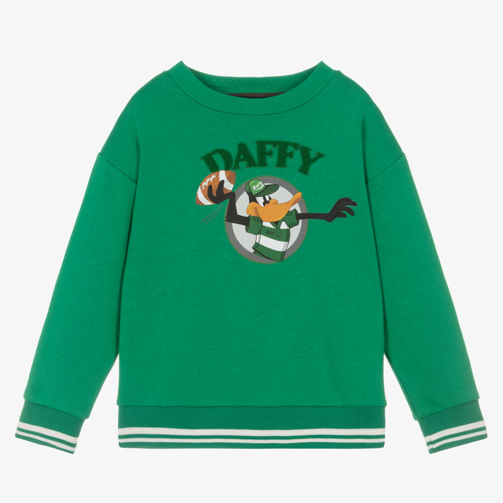 Boys green varsity-style sweatshirt by Monnalisa. Made in a soft cotton jersey, it has ribbed striped trims for a sporty, yet cosy fit. It has a Daffy Duck rugby graphic on the front with bouclé lettering appliqué for a fun, textured finish. There is a rubberised monogram logo on the back of the neck for a subtle designer touch.