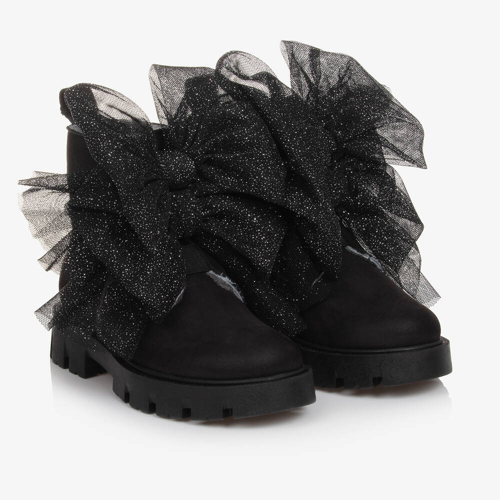 Glamorous black ankle boots for girls by Monnalisa, made from smooth suede leather. Decorated with statement tulle bow decorations sprinkled with silver glitter for added sparkle, they fasten with a zip and velcro tab on the side. Lined in soft fleece for extra cosiness, they have chunky rubber outsoles with deep treads for better grip.