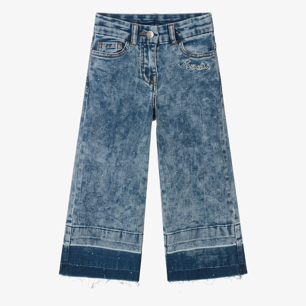 Fabulous wide-leg denim jeans for girls by Monnalisa, with an edgy blue stonewash design. Signed with champagne gold logo embroidery below the front pocket, these cool trousers are decorated with diamanté studs for that all-important sparkle. They have a gold-tone front button and zip fastening, a gold-glitter resin and metal logo patch on the back, and boho fraying on the hem. An adjustable waistband ensures a comfortable fit.