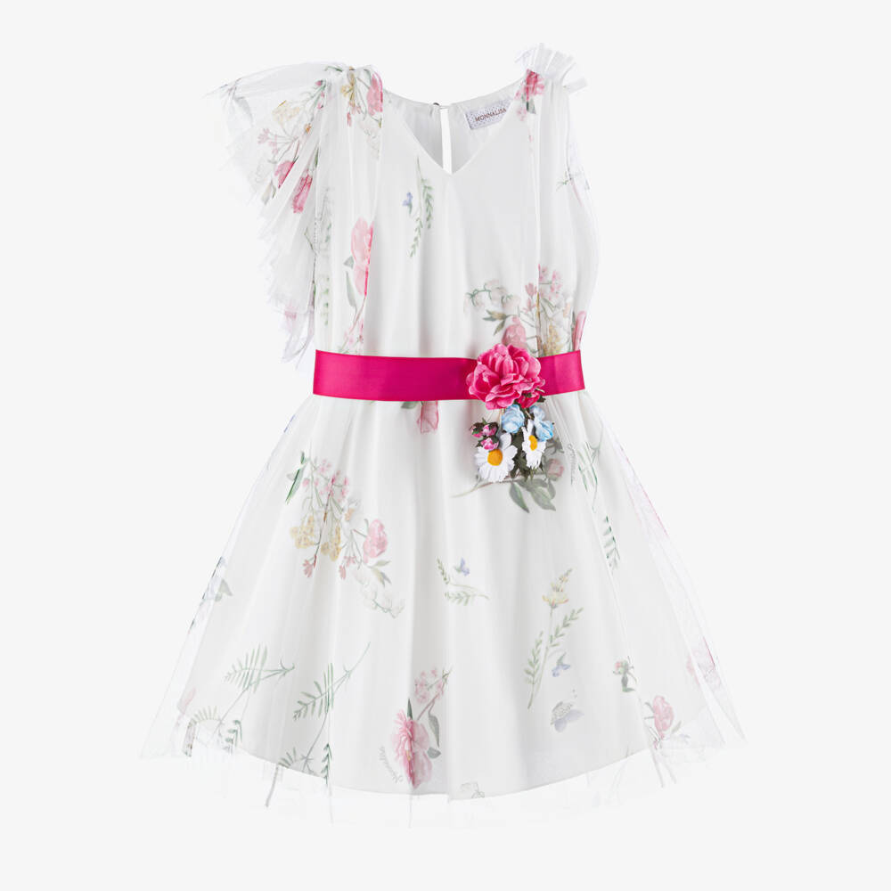 Beautiful ivory and pink floral dress for girls by Monnalisa, ideal for special occasions. This asymmetric style is made using fine tulle, layered and gathered for luxurious volume. One sleeve has a stunning ruffle drape, adding a chic touch. Lined in cotton for comfort, it has a stylish keyhole button fastening on the back. To tie the elegant look together and cinch the waist, there is a fuchsia pink satin sash belt with lovely, delicate flower appliqués.